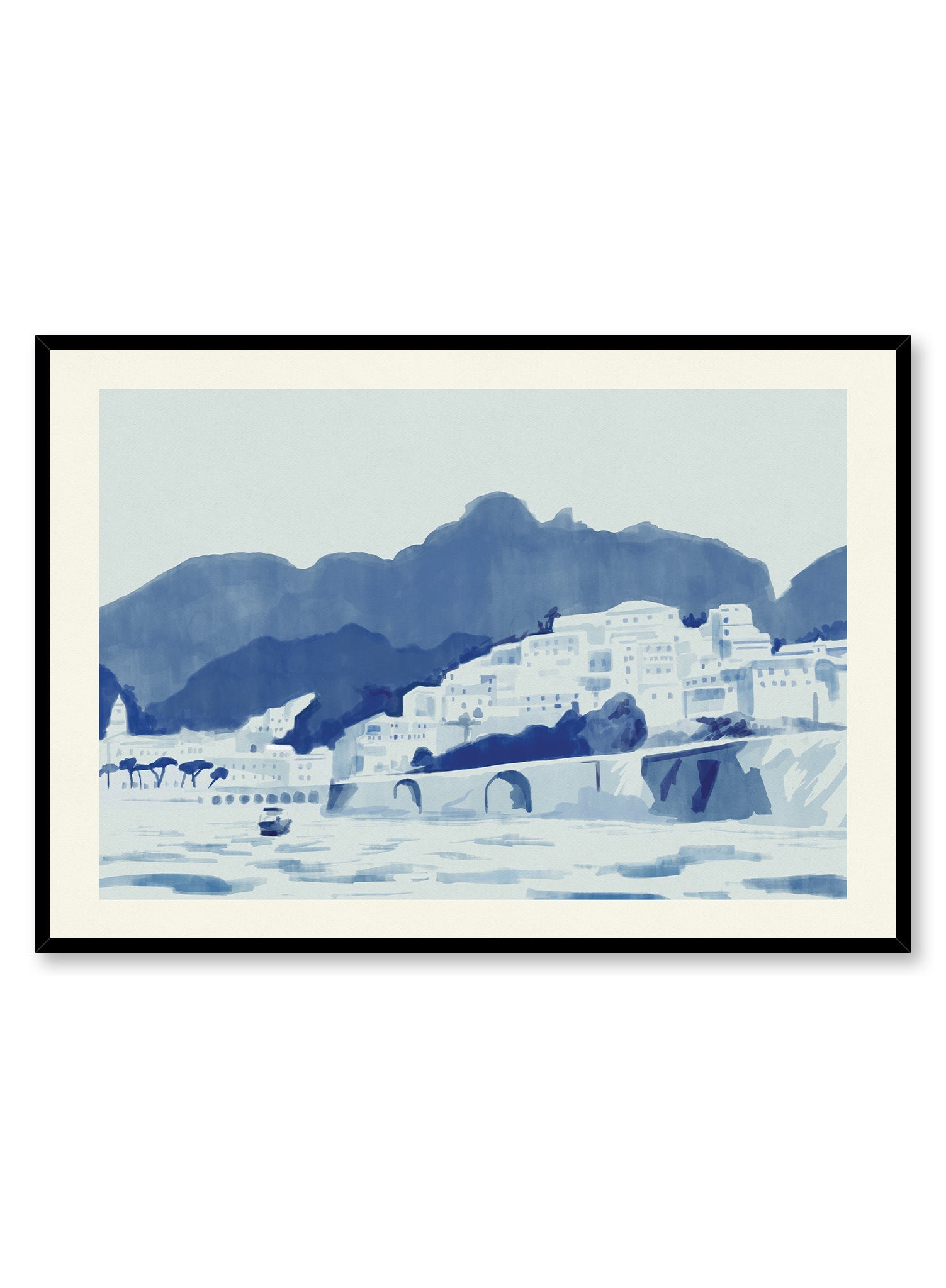 This evocative landscape print beautifully depicts a coastal village cascading down a rugged mountainside to meet the sea. The scene, rendered in an expressive, painterly style, captures the organic architecture and stunning natural setting of a classic Mediterranean town. The simplified forms of the buildings, bridges, and boats create a peaceful and harmonious composition that invites the viewer to imagine a quiet afternoon spent exploring its sun-drenched streets.