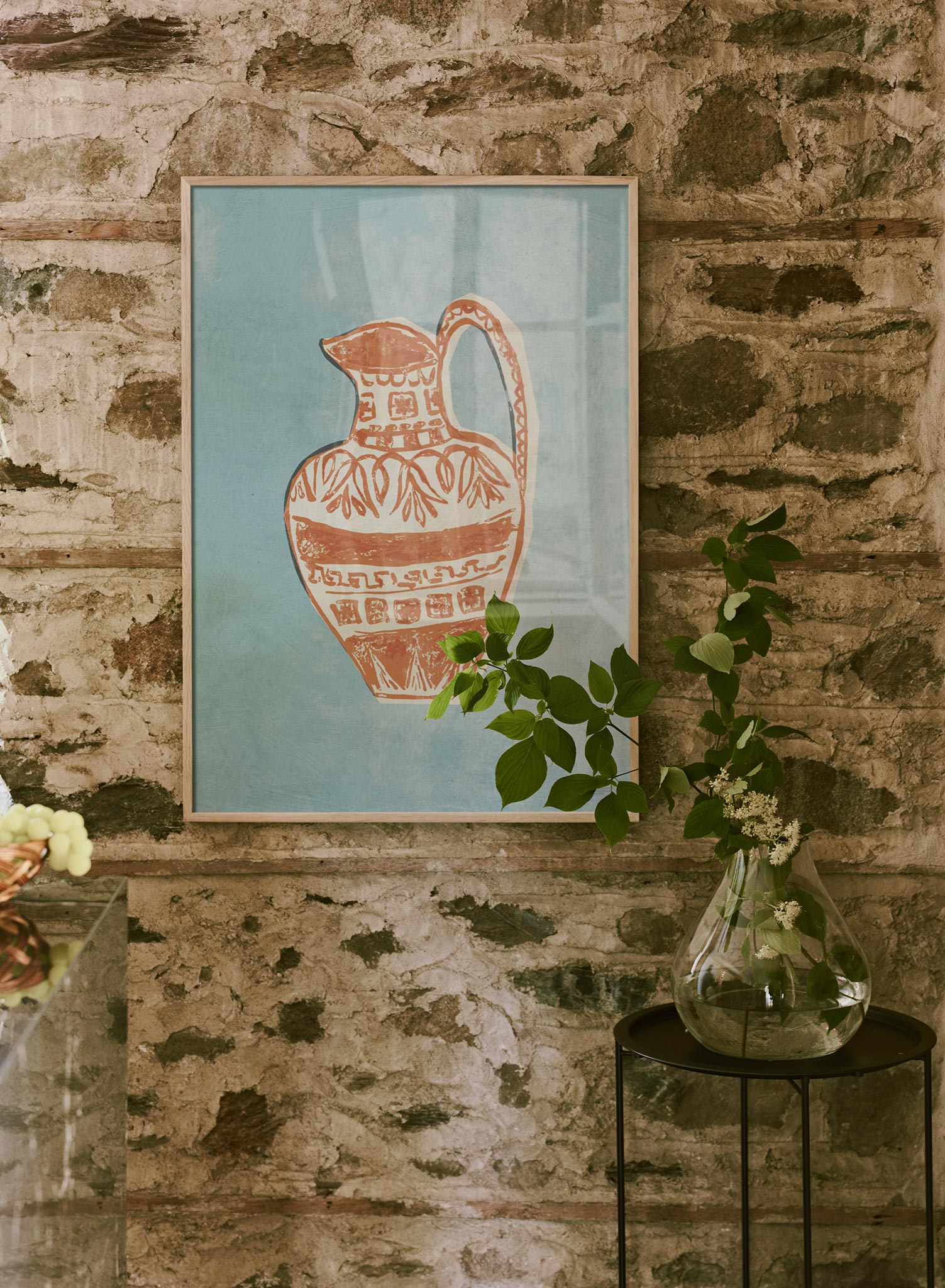 This art print features a beautifully stylized amphora, its form rooted in classical antiquity but rendered with a fresh, modern sensibility. The vase is decorated with delicate botanical motifs and traditional geometric patterns, giving it a rustic, artisanal character. The illustration’s block-printed aesthetic celebrates the beauty of hand-crafted objects and the enduring appeal of Mediterranean design traditions, making it a perfect piece for bringing an earthy, sculptural element into a space.